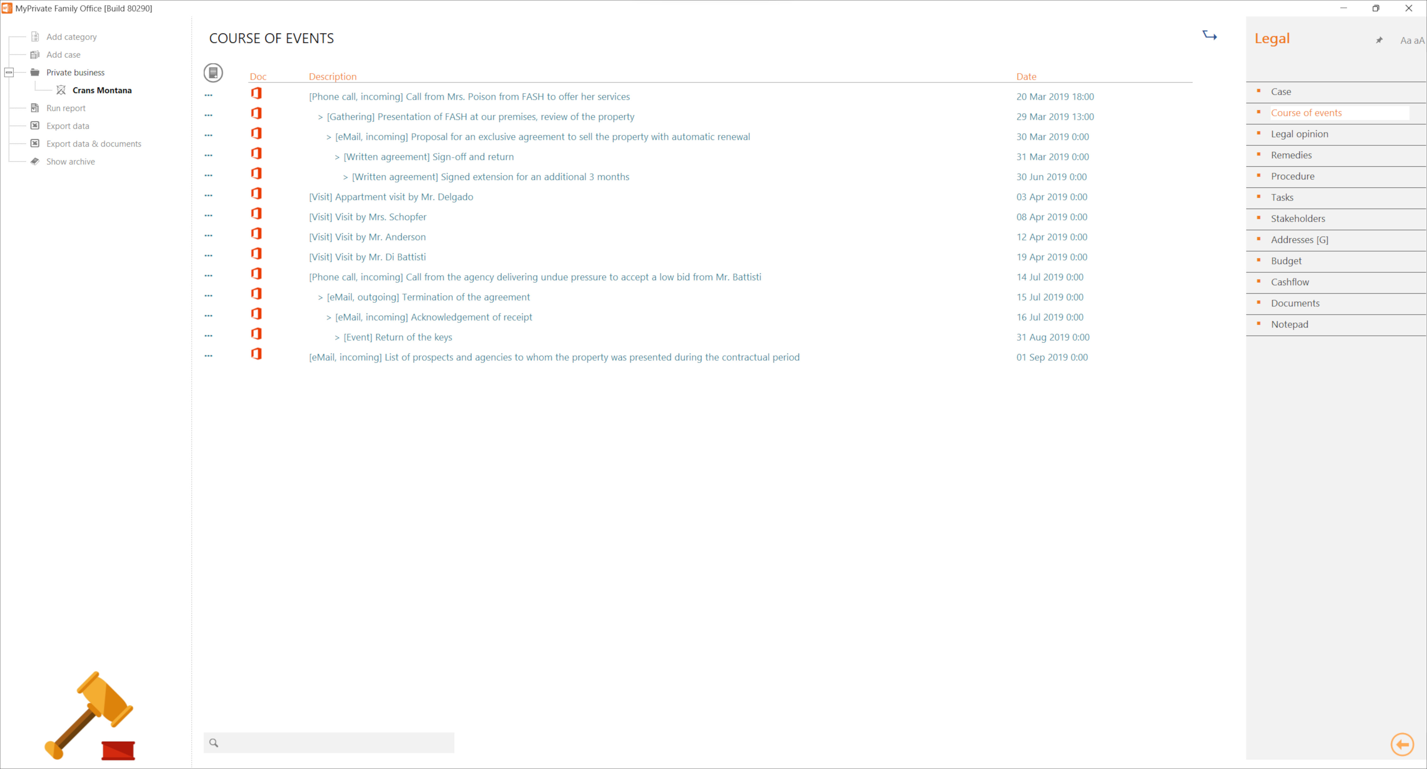 The "Legal" module allows to document and monitor the cost and evolution of legal affairs, deeds, litigation, etc.